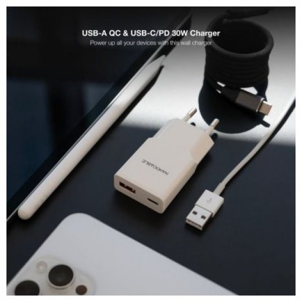 - 1 x Cargador USB-C/PD 30W + USB-A/QC 30W, Blanco