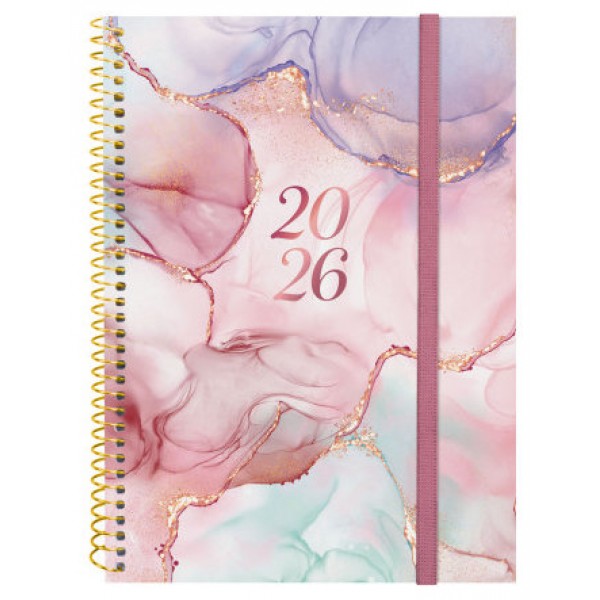 Agenda de espiral con tapas ligeras de polipropileno. Diseño en tendencia y a la moda. Ideal para uso personal y/o profesional. Con goma elástica. Con esquinas microperforadas para localizar rápidamente el día/semana en curso. El diseño interior es limpio y fácil, con espacio suficiente para organizar tus proyectos, tareas y compromisos. Agenda con información de interés en la anualidad y otros contenidos extra orientados a la organización personal. Formato similar a DIN A5 con las ventajas de una agenda portable y una de sobremesa. Duración: Enero 2026 - Diciembre 2026 (12 meses). Interior: Semana Vista Horizontal. Visión de la semana completa en horizontal que permite la escritura natural. Con espacio para concretar horario. Con información de los festivos de España. La anualidad de la agenda incluye la información relativa a: onomástica, festivos nacionales, cambios de estación e inicios de los años nuevos chino, musulmán, ortodoxo y hebreo. La agenda dispone también de otros contenidos extra: datos personales, calendarios, horarios, objetivos del año, plan anual, fechas importantes, otras fechas, hojas para checklist, hojas para notas, hoja para ocio y hojas para teléfonos, direcciones y e-mails. Artículo en español con anualidad multilingüe: español, euskera, gallego y catalán. Formato: E10 - 155x212 mm. Tapas de polipropileno, espiral simple metálica y papel. 80 g/m². Papel FSC®.