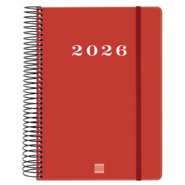 Agenda de espiral de estilo moderno y universal con tapa dura de cartón forrado con peliculado mate antirrayaduras. Ideal para uso personal y/o profesional. Con goma elástica. Esquinas microperforadas para localizar rápidamente el día/semana en curso. Contiene información de interés en la anualidad y otros contenidos extra. Formato similar a DIN A5 con las ventajas de una agenda portable y una de sobremesa. Duración: Enero 2026 - Diciembre 2026 (12 meses). Interior: 1 Día Página. Amplio espacio de escritura para cada día. Con horas. Sábados y domingos en página completa. Con información de los festivos de España. La anualidad de la agenda incluye la información relativa a: onomástica, festivos nacionales, cambios de estación e inicios de los años nuevos chino, musulmán, ortodoxo y hebreo. La agenda dispone también de otros contenidos extra: datos personales, horarios, calendarios, planificación anual del año y del año siguiente, festivos internacionales, cómo buscar en Google, usos del teclado, mapa de Europa y de los husos horarios, hojas para notas y hojas para teléfonos, direcciones y e-mails. Idioma del artículo: español. Formato: E10 - 155x212 mm. Tapas de cartón forrado con peliculado mate antirrayaduras, espiral simple metálica y papel. 70 g/m². Papel FSC®.