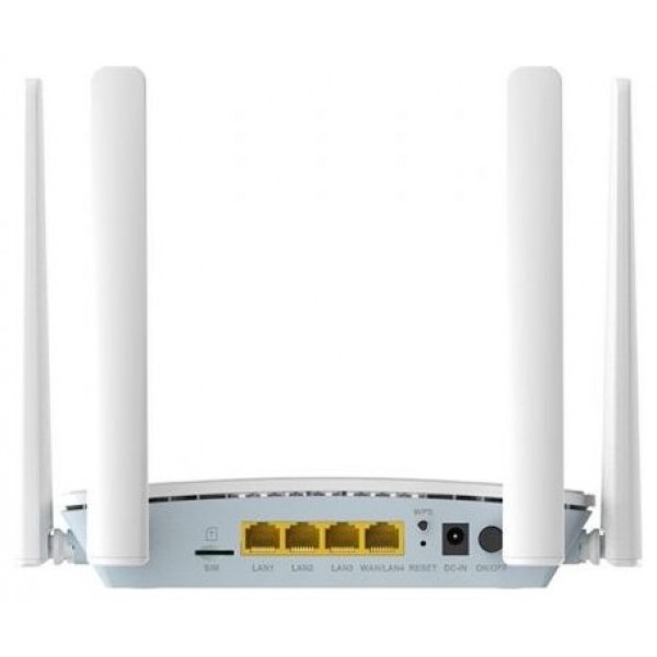 - Interfaces del dispositivo: 3 puertos LAN Fast Ethernet, 1 puerto WAN/LAN Fast Ethernet, botón WPS, botón Reset, botón de encendido, ranura para tarjeta SIM Nano (4FF), conector de alimentación