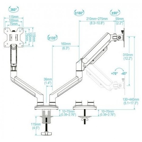 - Peso soportado de pantalla: Mínimo 2 kg, Máximo 10 kg por cada brazo