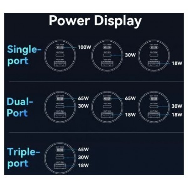 - Salida USB-C1 + USB-C2 + USB-A1: 45W + 30W + 18W