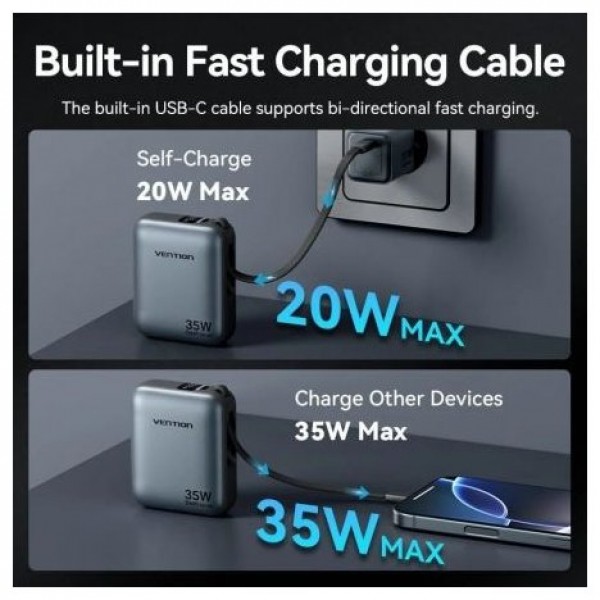 El cable USB-C incorporado y el puerto USB-C admiten carga rápida 35W PD y PPS, ideal para portátiles, tabletas y teléfonos.