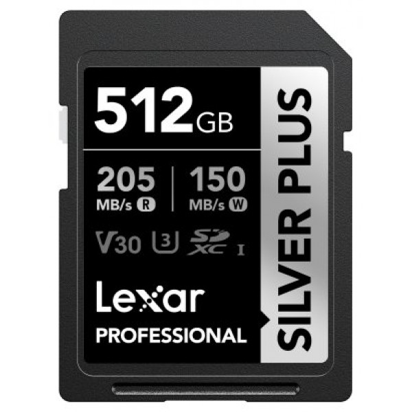 Lexar Professional SILVER PLUS. Capacidad: 512 GB, Tipo de tarjeta flash: SDXC, Tipo de memoria interna: UHS-I, Velocidad de lectura: 205 MB/s, Velocidad de escritura: 150 MB/s, Clase de velocidad UHS: Class 3 (U3), Clase de velocidad de vídeo: V30. Funciones de protección: Protección contra caídas, Protección contra campos magnéticos, Resistente a golpes, Resistente..., Color del producto: Negro
