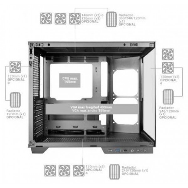 - Capacidad de ventiladores: Hasta 9x 120mm o 6x 120mm + 2x 140mm