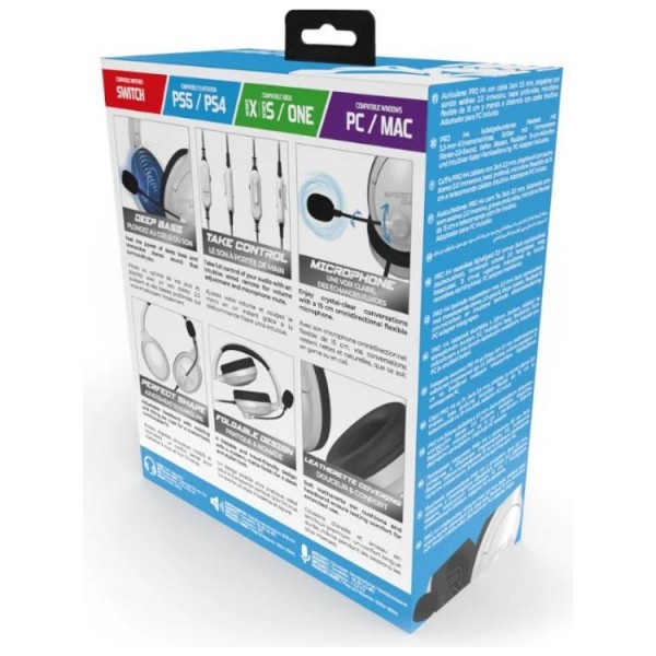 | Caracteristicas | - Plataformas compatibles: Nintendo Switch, PlayStation 4, PlayStation 5, PC y Mac, telefonos inteligentes, Xbox Series S, Xbox Series X, Xbox One - Estandar de audio: estereo, Windows Sonic - Conector secundario: adaptador jack 3,5 mm PC - Tipo de casco: circumaural - Control: mando en cable (volumen +/-) - Sensibilidad de casco: 113 dB (+/- 3 dB) - Frecuencia del casco: 20 ~ 20 KHz - Impedancia del casco: 32 ohmios - Tipo de microfono: omnidireccional, flexible - Sensibilidad del microfono: -35 dB (+/- 3 dB) - Frecuencia del microfono: 20 ~ 20 KHz - Impedancia del microfono: 2 ohmios - Conexion: jack 3,5 mm - Longitud del cable: 2 metros - Color: blanco - Materiales: almohadillas HP, diadema y base de arco Dimensiones y peso - 17 x 9 x 20,5 cm Contenido - Adaptador de PC - Auriculares PRO-H4 - Guia de instalacion rapida |