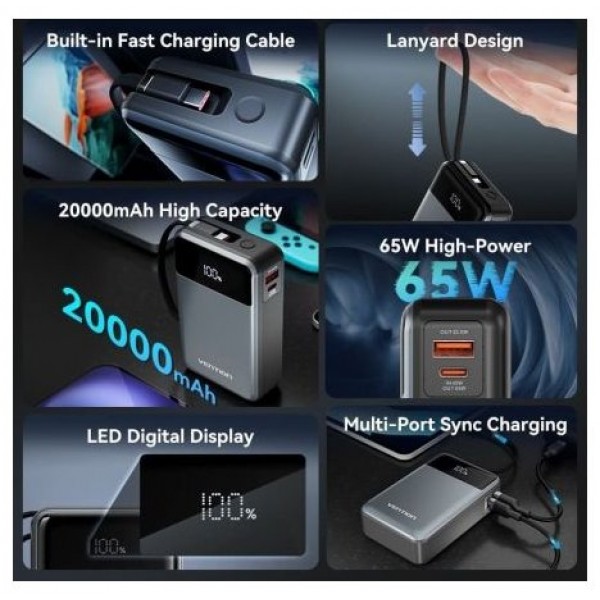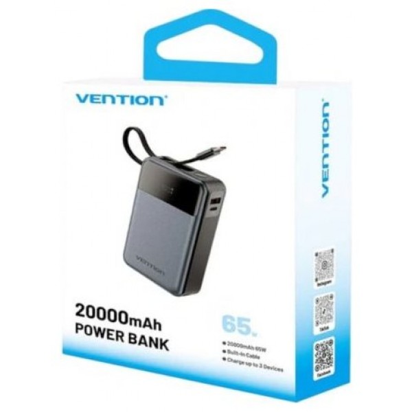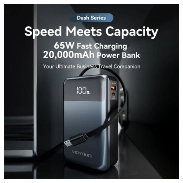 20000mAh Power Bank (USB-C + USB-C/USB-A) with Built-in USB-C Cable 65W Black LED Display Type
