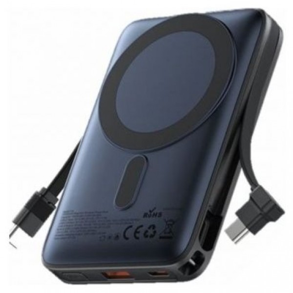 Batería externa magnética de 10,000 mAh (USB-C + USB-C/USB-A/Inalámbrico) con cable incorporado y soporte. Potencia de salida: 22.5 W Pantalla LED blanca Material: ABS con recubrimiento UV Soporte de aleación de aluminio