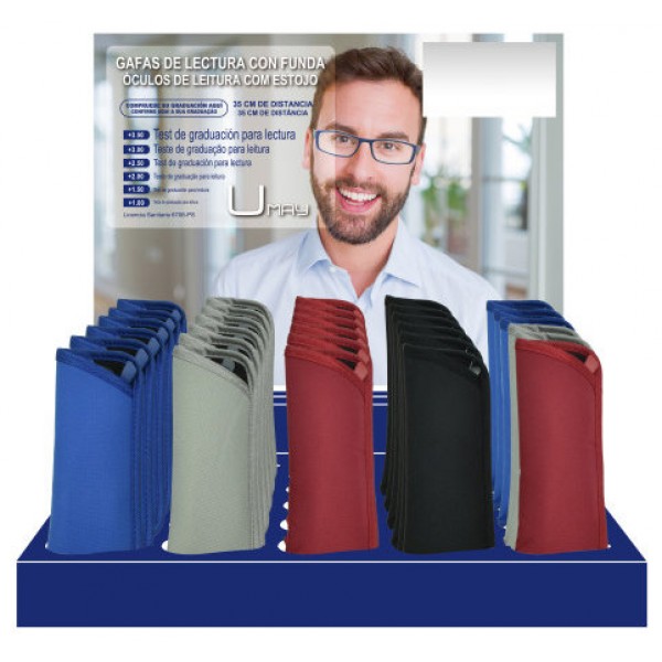 EXPOSITOR 30 GAFAS LECTURA CABALLERO PATILLAS FLEXIBLES 4 MODELOS COLORES Y GRADUACIONES SURTIDOS UMAY 329652