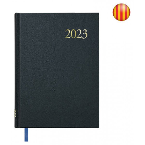 Agenda anual en Catalán. Cubierta realizada en material vinílico con cartón contracolado de primera calidad. Interior semana vista, impresa a un color en papel offset blanco de 70 grs., con 144 páginas. Datos personales, Calendario trienal, Planning del año, Páginas para anotaciones y Listín. Cabeceras en 5 idiomas (Castellano, Catalán, Gallego, Euskera y Portugués), Onomástica, Semana, Calendarios del mes actual y siguiente. Con mapa de carreteras de España y Portugal en dos páginas.