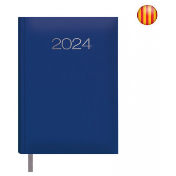 Cubierta realizada en polipiel con cartón almohadillado de primera calidad y estampación del año con película de color plata en la portada. Encuadernación cosida con lomo redondo, cabecera y cinta de registro color gris. Bloque interior 336 páginas en papel offset color ahuesado de 70g. impreso a 1 color, con certificado FSC mixto. Anualidad día/página (6 páginas por semana. Sábado y domingo en la misma página). Contiene: datos personales, calendario trienal, planning anual, indicativos internacionales, páginas para anotaciones y listín telefónico, onomásticas, Calendario impreso del mes actual y siguiente. Mapa de carreteras de España y Portugal en 2 páginas a color. Tamaño 14 x 20 cm. Color Azul. Idioma: Catalán.