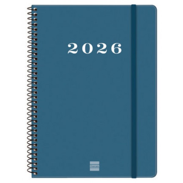 Agenda de espiral de estilo moderno y universal con tapa dura de cartón forrado con peliculado mate antirrayaduras. Ideal para uso personal y/o profesional. Con goma elástica. Esquinas microperforadas para localizar rápidamente el día/semana en curso. Contiene información de interés en la anualidad y otros contenidos extra. Formato similar a DIN A5 con las ventajas de una agenda portable y una de sobremesa. Duración: Enero 2026 - Diciembre 2026 (12 meses). Interior: Semana Vista Horizontal. Visión de la semana completa en horizontal que permite la escritura natural. Con espacio para concretar horario. Con información de los festivos de España. La anualidad de la agenda incluye la información relativa a: onomástica, festivos nacionales, cambios de estación e inicios de los años nuevos chino, musulmán, ortodoxo y hebreo. La agenda dispone también de otros contenidos extra: datos personales, horarios, calendarios, planificación anual del año y del año siguiente, festivos internacionales, cómo buscar en Google, usos del teclado, mapa de Europa y de los husos horarios, hojas para notas y hojas para teléfonos, direcciones y e-mails. Idioma del artículo: español. Formato: E10 - 155x212 mm. Tapas de cartón forrado con peliculado mate antirrayaduras, espiral simple metálica y papel. 80 g/m². Papel FSC®.