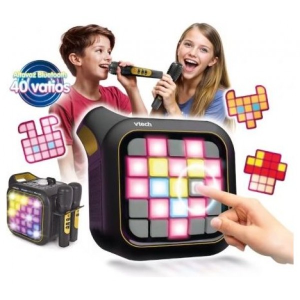- Dos micrófonos para cantar a dúo, con 4 botones con efecto vibrato, efecto que simula coros y efectos para modificar la voz.