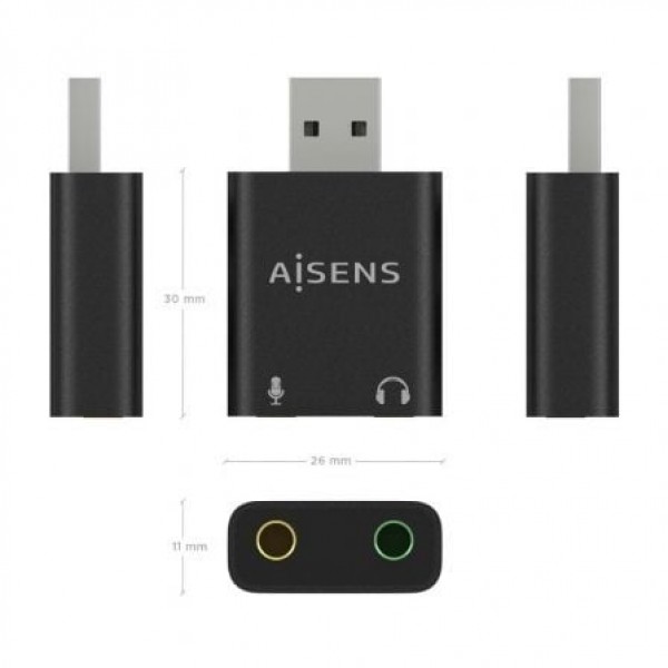 - Conversor USB-A a AUDIO, con conector USB-A en un extremo y 2xJACK 3.5 3 pines hembra en el otro.